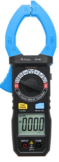 O Modelo ET-3167 oferece uma ampla gama de funcionalidades, incluindo medições de Tensão AC/DC, Corrente AC, Resistência, Capacitância, Continuidade, Diodo, Temperatura, Frequência, Duty Cycle e Corrente de Partida (Inrush). Além disso, possui recursos como Max/Min, Data e Peak Hold, Lanterna e Luz de fundo. Ideal para medições em instalações elétricas de alta tensão, medições de corrente e tensão em sistemas industriais, prediais e residenciais.
